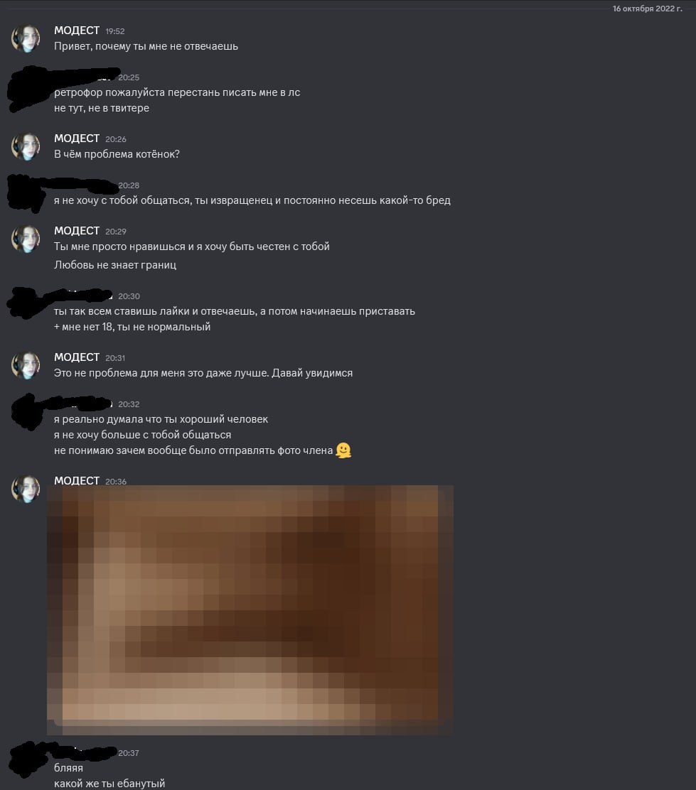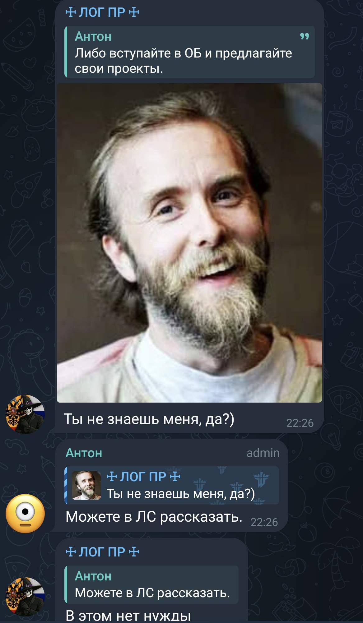 >>25987749 Я пока ещё ничего не решил. Но меня напрягает его хуйня про "отрезание головы" и тот факт, что этот засранец подослал своего дружка мне в личку с фейковым вбросом У меня на руках материалы дела по сути готового, сидит Ретрофор в России, чаты (один из) по скриншоту видно, что было в ВК, что упрощает всё, один запрос и всё будет, как на ладони, а дальше как обычно
