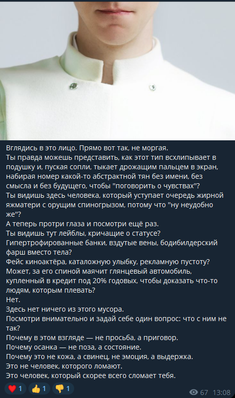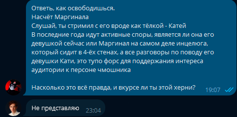 Но я всё равно считаю, что он тебя заебёт Дарья, тебе тупо скучно с ним станет со временем. Нету импакта понимаешь, он обычный типикал нормис. И даже наверное половину того, что ты пишешь в своём ТГ-канале не понимает лол