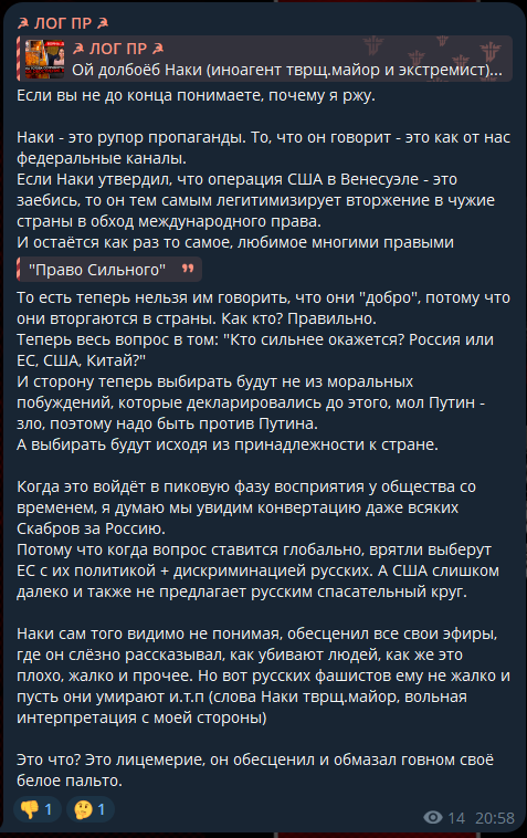 >>26057089 > И с какого хуя ты вообще решил, что имеешь право кого-то вписывать в русских/украинцев/киргизов, а кого-то нет маня? Если что-то квакает как утка. Ты последовательно отдаешь предпочтение про-украинским ресурсам, считая их более правдивыми при этом весь твой новый канал построен из нападок на про-российских спикеров и Штефанова с узбеком. Просто я политизирован и вижу лес за деревьями. Тебе это не нравится.