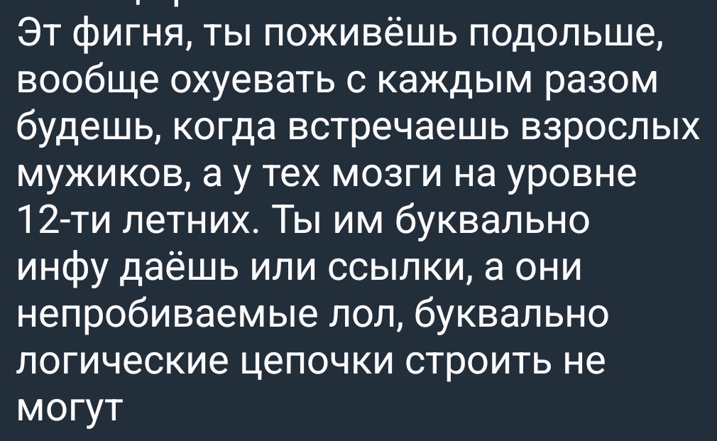 Охуеваю с развития современных взрослых мужиков, у них мозги на уровне 12-ти летних. Ты им буквально инфу даёшь или ссылки, а они непробиваемые лол, буквально логические цепочки строить не могут >>25987630
