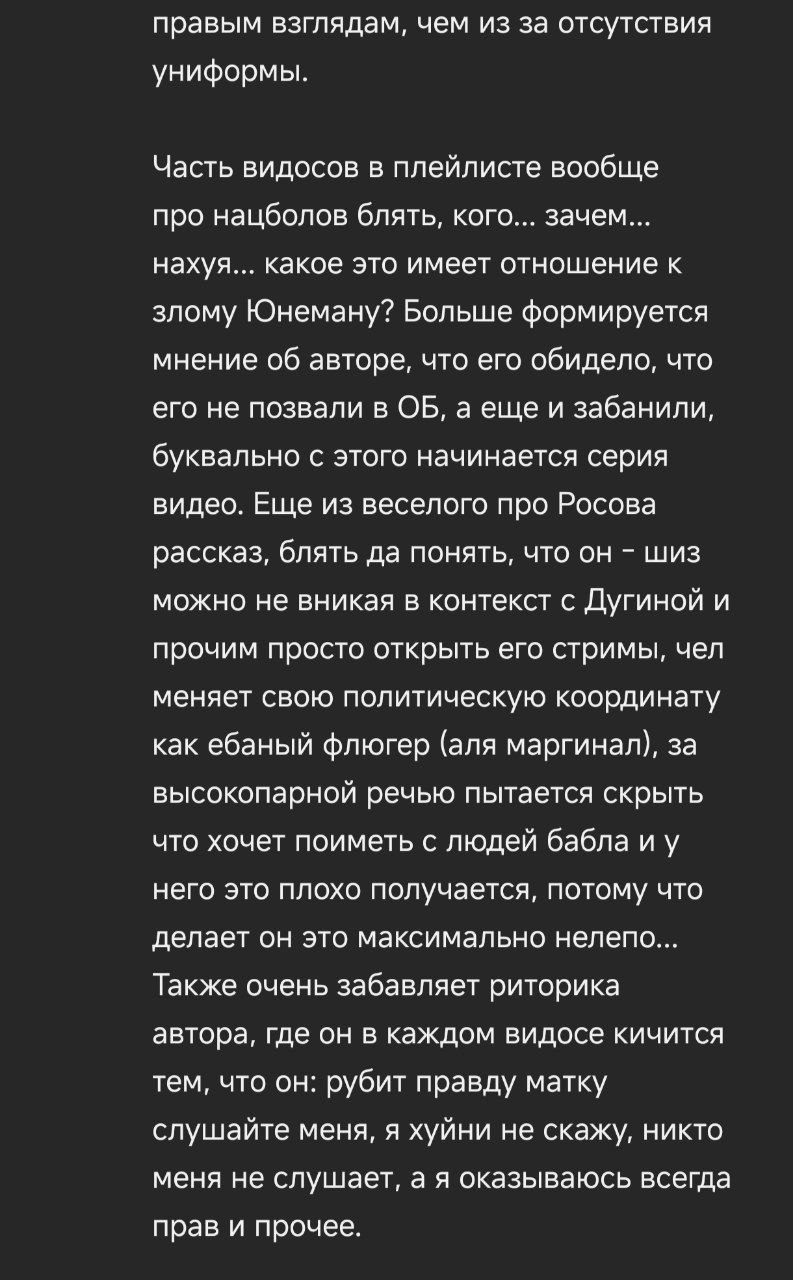 Сабж умудрился за рекордно короткое время прокатиться по всему подвалу рунета, одновременно обсуждая и красных, и правых, и в процессе случайно добился самовыпила собственных каналов на Ютубчике. Причина классическая — фута-контент, за что его в итоге аккуратно вынесли с ру-ютуба, но это не точно. Дальше всё по учебнику, как полагается каждой микро-селебе из околополитического болота, завёл личный шизо-чатик в телеге. Там он круглосуточно заливает поток сознания — от нытья про тян (с акцентом на вечную драму с бывшей Данилинга) до тяжёлой геополитической шизы про будущее России. В довесок приплетает андеграундные кружки уровня Светова, Юнемана и прочих Жожеков, чтобы выглядело солидно. Преподносит себя так, будто у него аудитория на пару сотен тысяч и его мнение весит хотя бы что-то (спойлер: нет). Но, внезапно, вызывает неподдельный интерес публики, будто у него есть какой-то тёмный лор и политическая тусовка Ютуба реально в курсе, кто он такой, просто молчит.