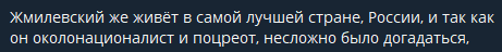 >>26036415 > БЛЯ, ОКОЛОНАЦИОНАЛИСТ . Миллион раз объяснили. Криштофф хохол, нет никакой то там гуманист или с дальними родственниками по тетиной линии из Ивано-Франковско, а самый настоящий украинец с родственниками в той стране. Темка с сво для него личная трагедия, когда он видит как родственники отказывается от него по причине русня з челябы. Любой кто за зет для него нацист и палач украинского народа.