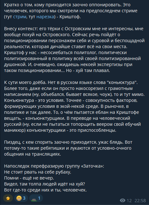 Если кому-то кажется что этот персонаж не шиз, вот скрин его нытья в своем канале на анона, более жалкого скулежа я давно не встречал. Не ясно с чего он взял что я смотрю Сармата или еще кого-то популярных стримеров. Тем более не ясно почему он себя противопоставляет им, видимо, считая свой КАЛтент элитным или каким-то особенным. Он настолько же элитный и особенный, насколько элитным и особенны является поедание говнеца по утрам. Курьер с кризисом среднего возраста, напялил на себя шляпу и пытается молодиться словно ошизевший анк, симпуя на полном серьезе каким-то девкам которым на него пох.