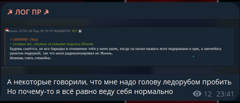 Ещё одно. Ты выше пишешь, что будешь кидать доносы на педофила за педофилию (одобряем), но сам же даёшь ему компромат для контр-доноса по более тяжёлой статье. При этом в теории педофил может быть не быть педофилом, а это переписка солевых зумеров которые тебя разыграют всей конфой, но у тебя же реальный состав преступления.