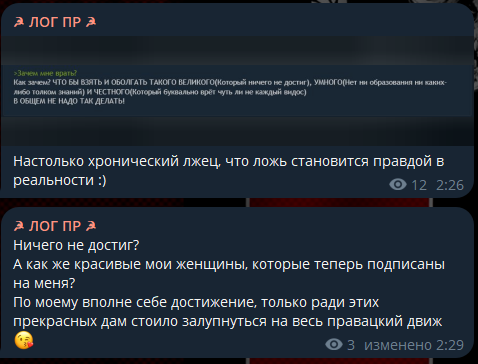 >>26019810 > Вообще-то была стабильность, просто его ВЫПИСАЛИ из ДВИЖА Стабильность в создании лекций, которые никто не смотрел. Ну то есть буквально контент, который должен был набирать на пост-просмотрах уходил в унитаз сразу после стрима. инб4 ааа ряя рассияни не хотят интересоваться историей. Даже лекции Погрома и старые видосы бушвакера с набирают просмотры, а Росова нет. > Чел, он при всём своём положении до сих пор получает окупы и имеет от 100к+ в месяц Инвестировав в канал несколько лямов? > что аж у меня уже полыхнуло А есть люди от которых у тебя не горит? Почему любой публичный контакт с крейтерами, которых ты заранее не обожаешь приводит к пожару в районе твоего очка? > Она удалена, ты же сам сказал. Что тебя мешает спросить? > Это тот самый чувак-католик, который порвался на теме про минет от жены, и после этого решил публично использовать диванон меня от моих хейтеров? Ты тот самый курьер из Киргизии, котрый хотел уехать с Росовым в Бразилию, чтобы пожениться? Не понимаю почему ты пишешь, что подтверждает мои слова. Прибалт постоянно бахает при личном общении, и даже с ним Райт Хистори достаточно долго поддерживал нормальные отношения, если Росов посрался с Владом после этого стрима, то это вина Колька, а не РХ. > Ответ дружку Акросса был одним дублем что ли сука? Я только вижу, как ты монтаже добавил туда скриншотов с чатгпт. > Слушай блять, я всем сказал одно и тоже Слушать блять сюда. Жмиль всем сказал одно и тоже на презентации он отвечает на стриме в формате лайв или по средствам реакции на ролик. То что начинаются манёвры жопой про "Жмиля меня боится, специально выпускает не хочет выпускать ролики лично про меня" нас все это уже заебало. Почему то рукожоп вроде тебя считает, что проще высирать полотна текста в своем уютном ТГК, чем прийти публично выйти на стрим в публичное поле обосрать его. Видимо кишка тонка. > Там по 3к просмотров. Это заказывали даже ВЕЛИКОМУ ЖМИЛЮ! В сентябре у тебя было 70 подписчиков теперь 230. Продюсирование от Ретрофора и Норувода дало свои плоды. Качают твой канал как могут, а ты все брыкаешься.