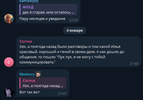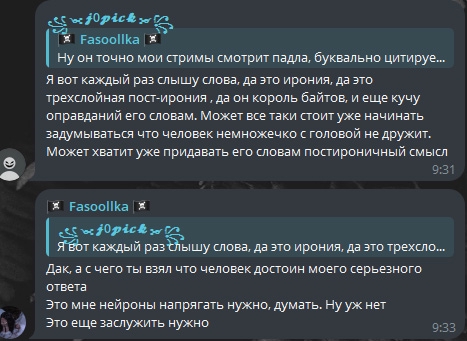 >>26050224 не путай людей подмененным своим сознанием, на вот эту тираду 2 января про нижний интернет пожилой писяет под себя и т.д он ответил простой констатацией факта, что прошелся по марамойкам, и то это пост за 4 января, этот пост больше о себе и разъеб себя, он 5 января потом зашел, написал у себя в тг перед этим, что у всех есть теневые и опять высрав жалостливый пост к себе, далее он зашел и попросил чекнуть ее еще одно сообщение в бусти, где опять же ее не оскорблял, и наткнулся опять на оскорбления и деф своих хозяек, где ему рассказали, что нужно было всего лишь стримить мафию, чтоб подняться, и дед не в курсе и не шарит и прочее говно, на что он в конце только упомянул "я не стримлю не из-за попусков марамоек" все его обзывания на все ее "приколы" 2 раза назвал ее мемным в его сообществе словом, которое да, оскорбительное, и его зафорсил ему лысый уебан жидовский, но это уже часть его коммьюнити говна. он потом срался со своими бывшими подсосами, которые нашли мертвого стримера ботовода и охуели, что их кикнули, а ботовода взяли на их место и снова начал прогонять телегу про ботов, потешаясь над ними, которые начинают прозревать. ну а пост, где он просто пересказал всем известную инфу - и это уже ты хочешь называть переходом на личности? 7 января 06:26 который всего по длительности, на что она уже ответила 4 минутной хуйней, где бахнула со своих же слов про себя, которые он просто повторил в голосовухе, что все заметили и теперь она ходит и рассказывает просто "а вот он моими же словами про меня говорит" и всё, это вся ее защита и методичка, которую и симпы повторяют, сухо говоря, что да дед ее стримы пересказывает, когда там есть вещи конечн, которые он накидывает, и она про себя не говорила. задушил? задушил. я просто не люблю, когда пиздят, и похуй, из каких умыслов, потому что в голове все перемешалось или с корыстной целью, но жопич сам, помимо 2 раз слово марамойка, примененного в качестве обобщения ее с аринян и ненормовой, чуханку не оскорблял.