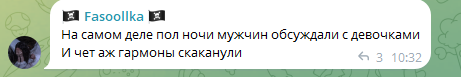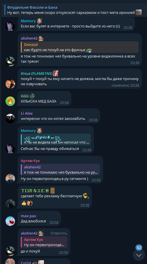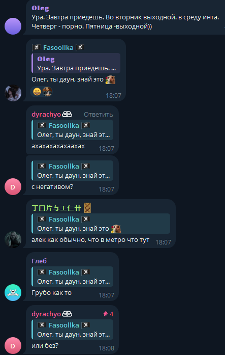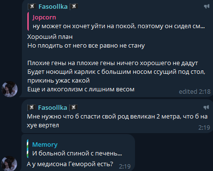 >>26044877 "при появлении альфа самца, у низших начинает вырабатываться тестостерон", что прекрасно видно на этих скринах, выделяются несколько человек из ее чата, которые пытаются подрывать авторитет альфа самца, попуская и оскорбляя его, такое поведение свойственно самым конченным кончелыгам из стаи, которые кукарекуют громче всех, а сами из себя ничего не представляют