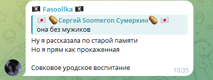 >>26044564 >Он написал очень вежливо Есть такое. Своей любезностью в чате всех обесукражил, все там ожилали от него, наверное, сразу с первых строк "дарова, марамойка, перди сливками!" не знаю. На это обратили внимание все ее симпы в тгшке и даже ей предъявлять стали что так жестко она про него. Потом пошли жалостливые посты в тг у него.