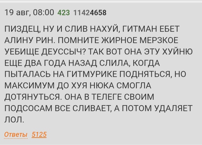 Двачеры: ШЛЮХА С ПРОБЕГОМ, ЕБАЛАСЬ С ОСУШНИКОМ (КОНЧАЛ ВНУТРЬ), СКОРО РОДИТ ОТ ГИТМАНА, СТАРАЯ, ВЕЧНОПИЗДЯЩАЯ, ЖИДОВСКАЯ ПОДСТИЛКА, НИКОГДА НЕ БЫЛА КРАСИВОЙ
