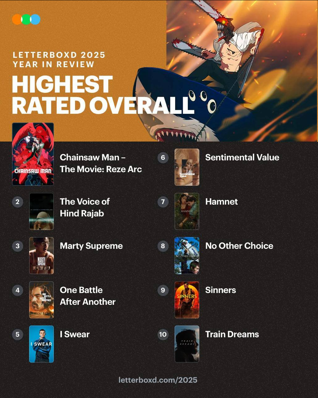 Чаще всего пользователи возвращались к «Супермену» Джеймса Ганна, а лучшую среднюю оценку среди релизов года получило аниме «Человек-бензопила. Фильм: История Резе» — 4,4 из 5. В топ высокооценённых также вошли «Голос Хинд Раджаб» и «Марти Великолепный», «Битва за битвой» и «Я ругаюсь».