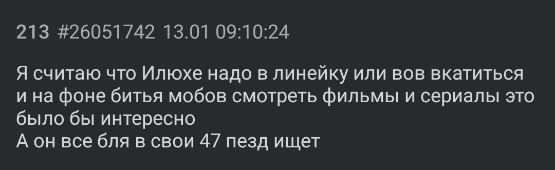 Все же Ильюха нас ценит. Нас тут сотня постеров сидит, а он нас цитирует, наши форсы подхватывает и скармливает чемоданам на 100к просмотров в телегу, а потом и на весь интернет. Мы - самая настоящая элита рунета, теневое правительство, задающее тренды.