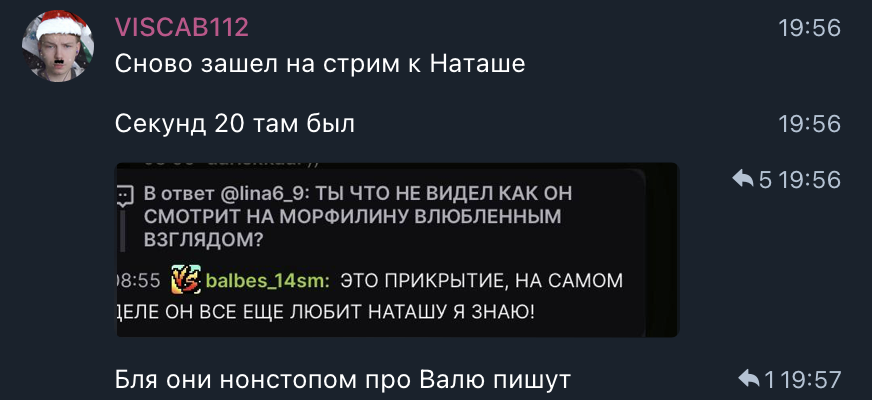 Короче у Наташки и Вади точно чет произошло. Странно что он на это сам намекает, как будто он обычно умалкивает. А тут еще и показывает, что это ее инициатива
