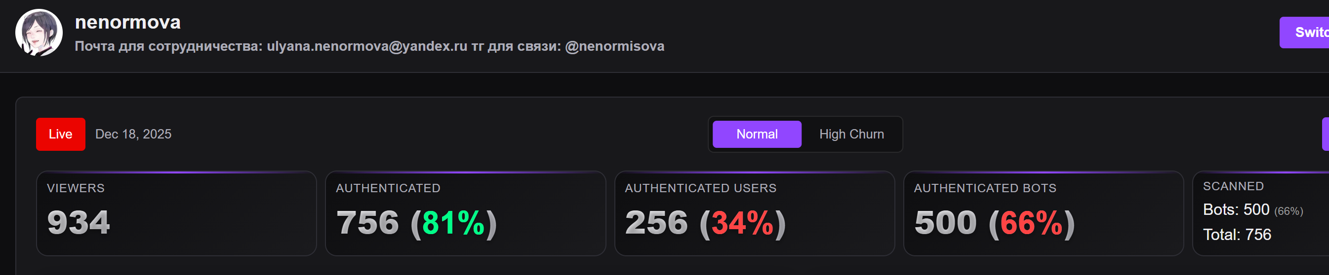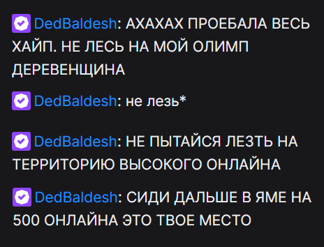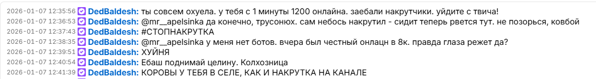 мне кажется балдеж прямо связан с ее последними накрутками: седьмого числа он заходил на ее высокий онлайн с отвалами ботов и как бы ее упрекал, но иронизировал что у него самого были честные 8к (его обычный около 200 человек) в тот момент у нее онлайн периодически вставал в веселое значение, в духе балдежа и жопича сегодня опять накрутка и опять его нелепые нападки ради демонстрации враждебности ну и любопытный факт, когда твич подавил ботов в конце лета, у балдежа был прирост онлайна до 800