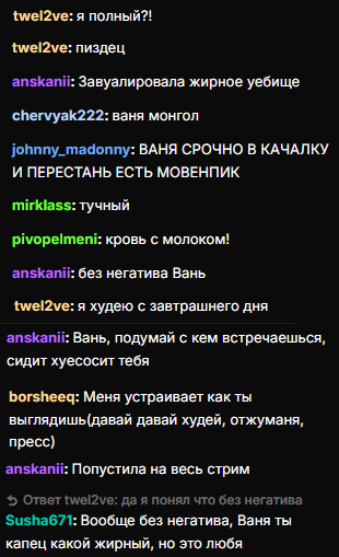 не вижу полякова в роли парня, мужа, только куколд привязанный к стулу с носком, вне куколдство выполняет все приходи поехавшей всё это делается на зло медисону, типа пустилась во все тяжкие я про это писал как только поляков был объявлен её парнем, медисон потом слизал эту теорию из треда и выдал недавно в голосовухе так же я писал что ему пора прекратить давать внимание всяким селючкам, бустить их, потому что ему от этого 0 профита, а шлюхам хорошо к примеру взять травомана, у него не такой большой онлайн, но он типа считается верхний твич(ладно средний) он узнаваем так вот понравилась ему селючка, но после встречи с ней он понял что сельский кайф не для него и произошел максимальный дроп каков из этого вывод не стоит строить отношение с нижним интернетом влезать туда с 2 ног, потому что ножки то отпилят, хапнешь хейта и проблем очернишь репутацию галя должна сосуществовать с такими же мутантами как и она сама на своём уроне мэдисону пора на покой я его ненавижу за то что он бустит всякий кал своим присутствием в ответ получает струи мочи каждый должен знать своё место в стримерской иерархии