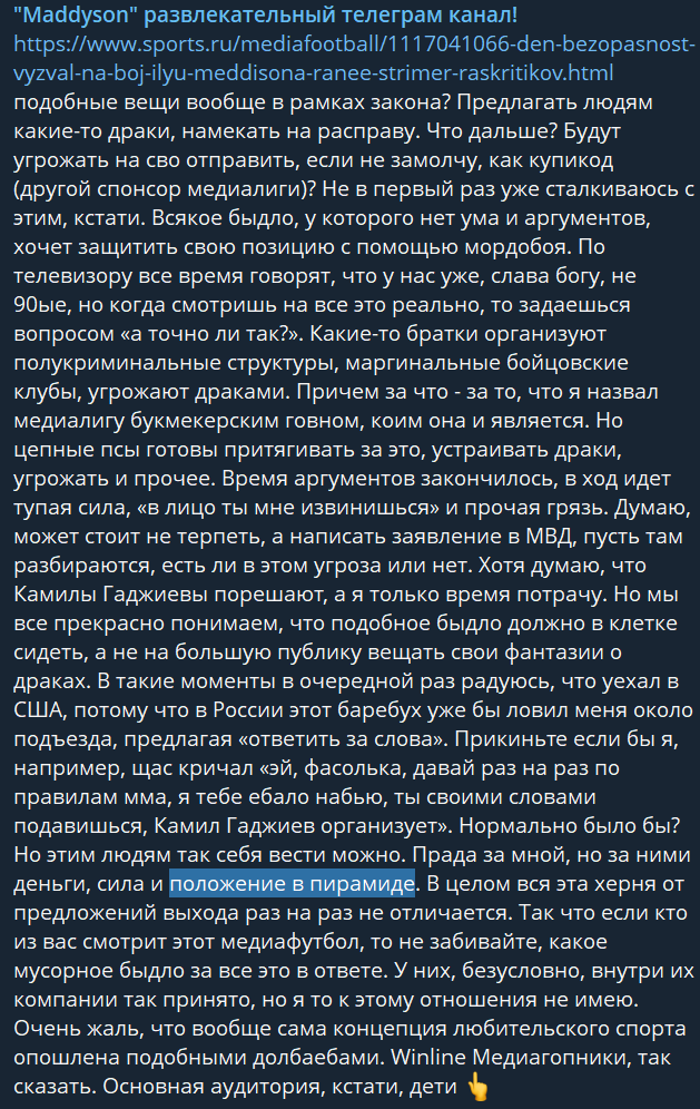 >>26071082 да он уже давно гнал на эту медиалигу, помню в телеге посты были год-два назад, тейки примерно те же - никому в реальности нахуй не сдался просмотр матчей с со сбитыми летчиками, профиками уровня первой/второй лиги, все хотят посмотреть как инвалид пандаэфикс пинает мяч против алкаша гены миллера и большеголового чмодья