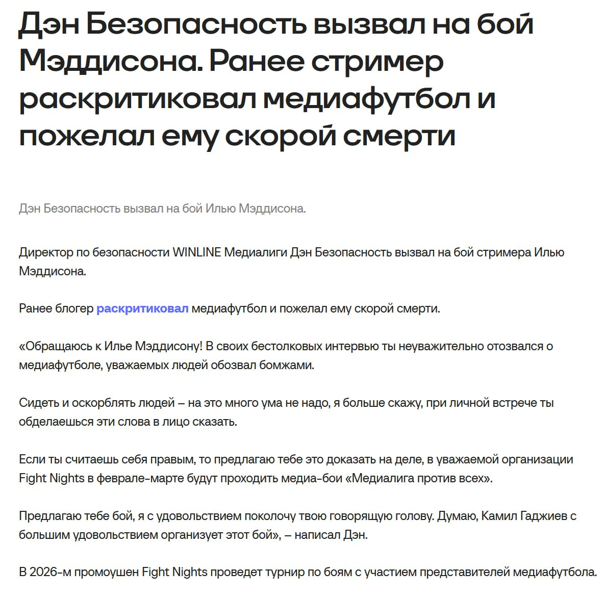 >>26074853 (OP) Илья Мэддисон ответил директору по безопасности Винлайна: Принимаю вызов, но драться я буду с Дианой Сараевой, поскольку именно она является серым кардиналом компании