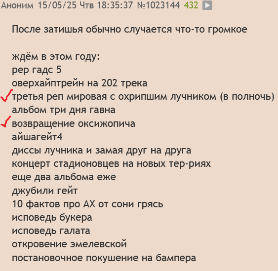 >>26013579 >>26014743 Разоблачения Айши то ли пиздежь, то ли она верит в то, что говорит. Но противоречий слишком много. Разобраны в ее тредах. Их даже два. Она требует возмездия, требует Жопича быть с ней, дополняет слив новыми и новыми интимками. Получает принудительную госпитализацию, и угрозу, что ей может светить отсидка в дурдоме. Айша продолжает амбициозно заявлять о себе и качать права. Потом затихает, становится скучной, находит нормиса малолетку. И вот, новое расставание. Посмотрим, какой там новый любимый репер.