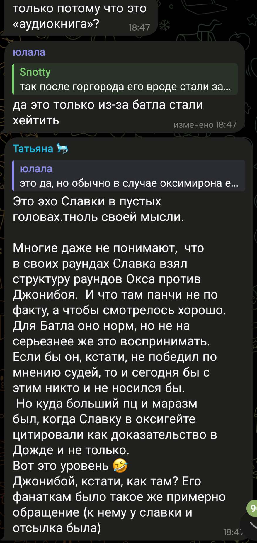 Борьба Оксижопича, итоги: 1. Выступал против любой войны, но сам оправдывал и поддерживал палестино-израильский конфликт; 2. Топил за свободу слова, но позволил своей бабе (кстати у которой мамаша базовая слониха) угрожать малолетке доносом за пропаганду ЛГБТ; 3. Поддерживал феминисток, пока катал своих баб на эмоциональных качелях и разносил им хаты в моменты скандалов, писал школьницам в ебучем контакте всякую срань; 4. Называл Славку слабаком и хуесосом, но вот уже больше десяти лет убегает от Димки Памперса, который каждый год вываливает про него грязное белье.