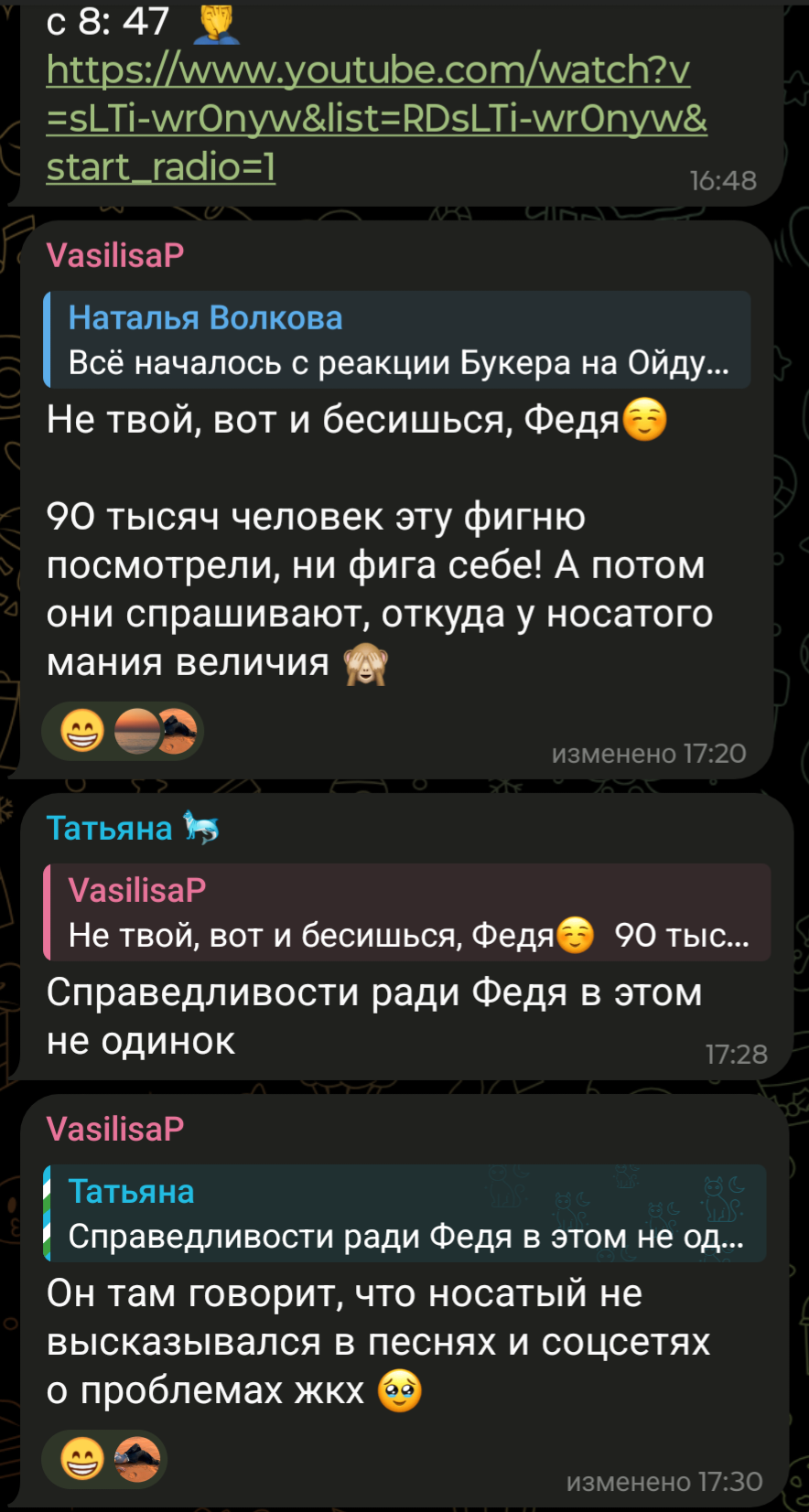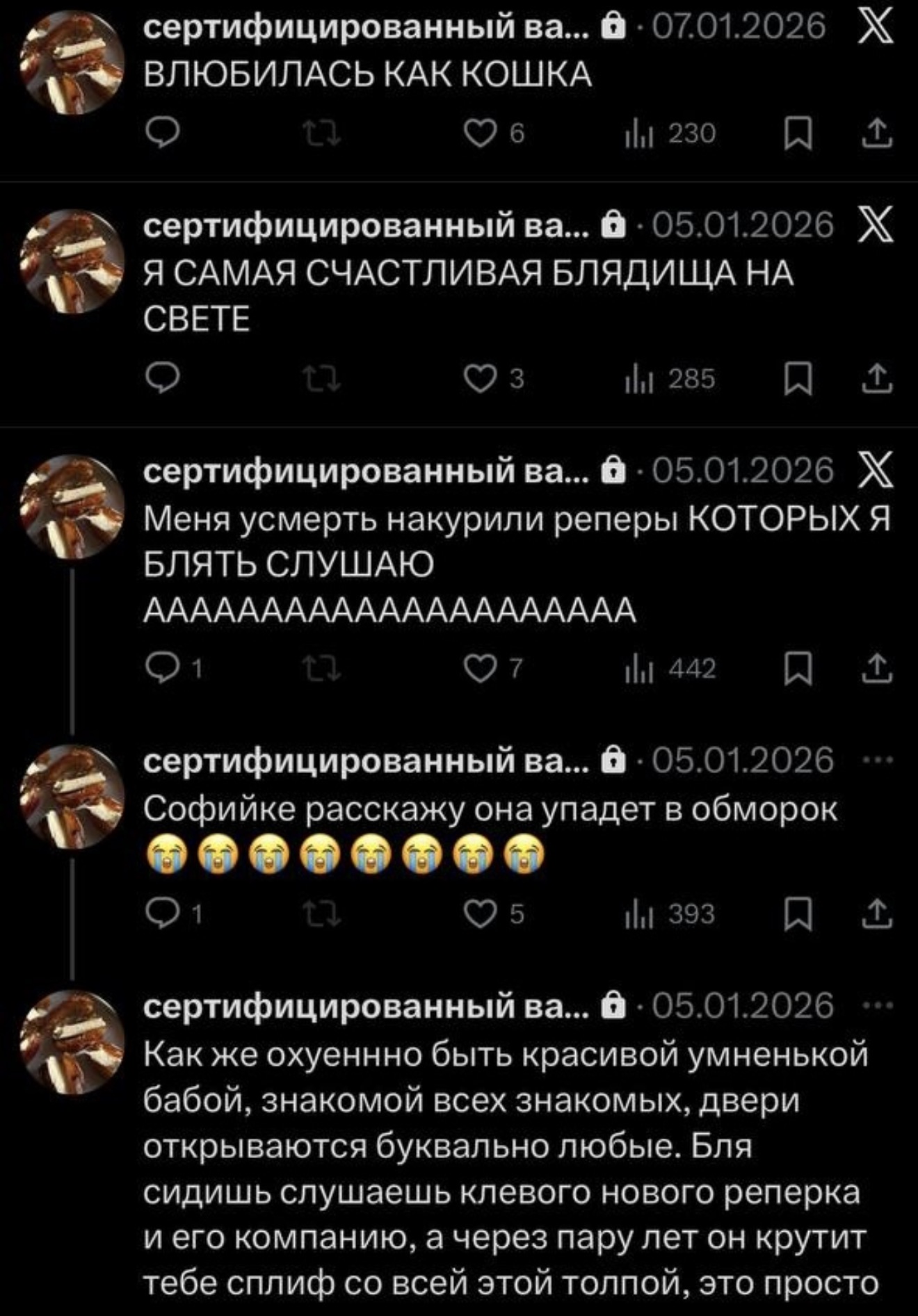 Еще раз: она выложила на продажу видео с отсосом, бусти заблокировал это через минуту, но это видео было похищено хакером и слито через год. Жопич сломал ей жизнь. Она жертва. Все из открытых источников, в основном ее интервью с дочкой кагарыча. Есть нарезки всех моментов, где она говорит, как с кайфом выкладывала в твиттер видео с зеркалом, чтобы Жопичу было стыдно и неприятно. Как хотела выложить отсос и туда, но Жопич пугнул ее родню ментами, и она залила на бусти. Как говорила «что ты мне сделаешь, я в другой стране». Где говорит как сама месяц разгоняла манию. Доставала его семью, Куромышь, и, судя по всему, делала это годами.