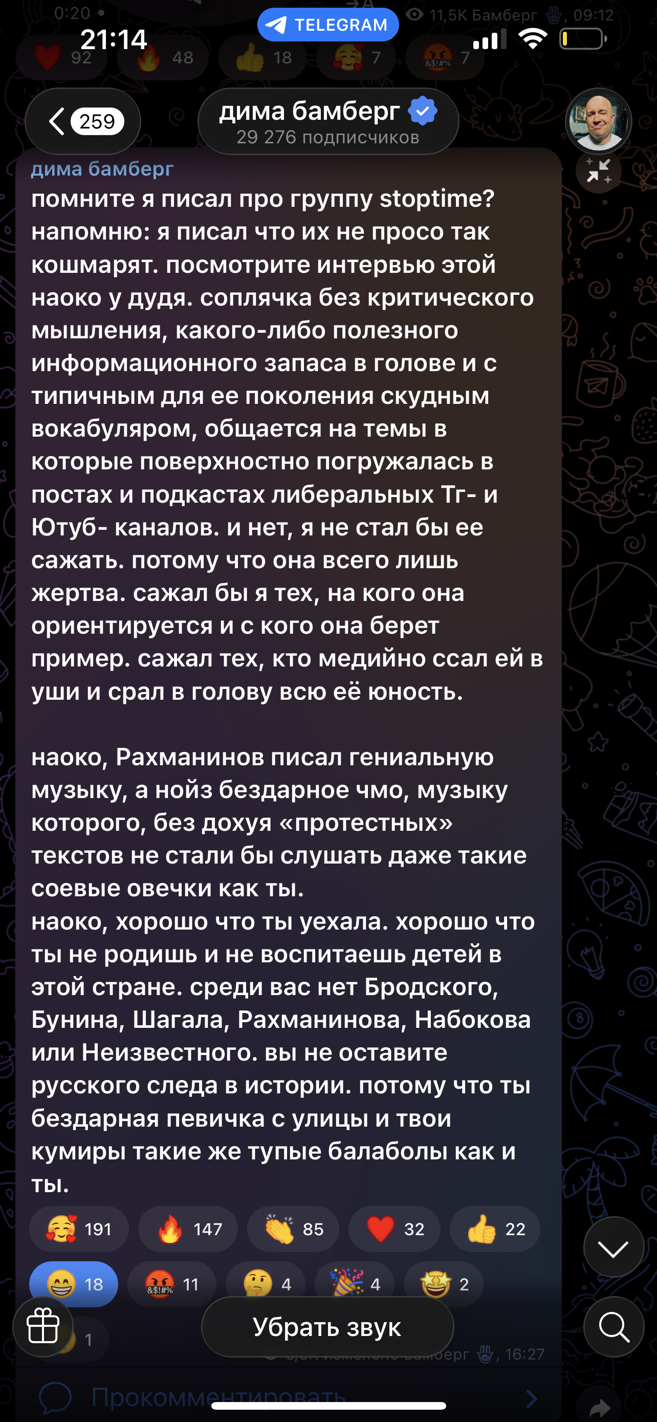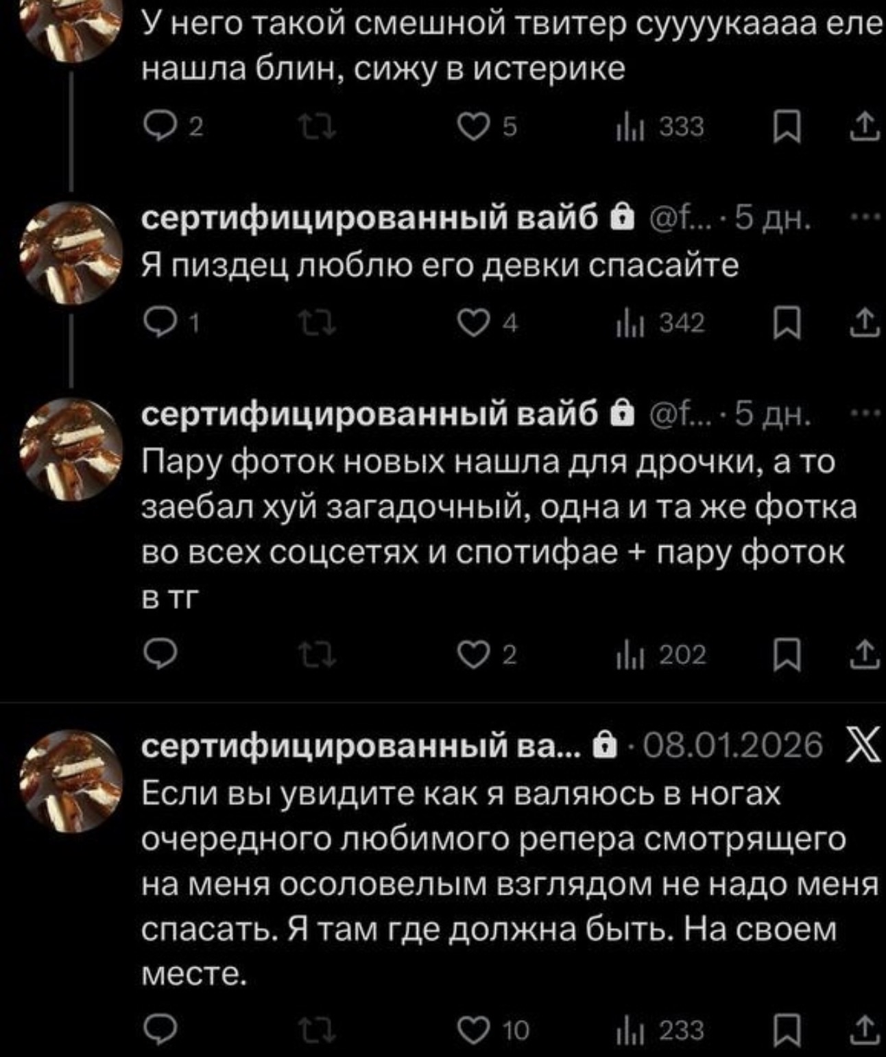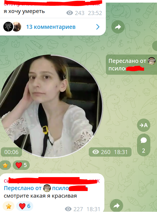 >>26068458 — В течение нескольких лет навязчиво следила за окружением КПСС, который её отверг, собирала информацию о его друзьях, знакомых и девушке, с целью последующего компрометационного использования. Публично оскорбляла женщин из его окружения, высмеивая их внешность, умственные способности и социальный статус с явным намерением унизить. Поведение носило признаки преследования, направленного на сохранение контроля и подавление через травлю — Публиковала интимные и личные подробности жизни КПСС, делая вид, что знает их из личного общения, в то время как контакт был кратким. Скорее всего выводы делались на основе его песен и постов, не различая лирическое и биографическое, сознательно создавая у аудитории впечатление близости и посвящённости, которой на деле не было — Систематически публиковала оскорбления и клеветнические высказывания в адрес друзей и родственников, приписывая им насилие, извращения, психические расстройства и моральную порочность - без фактов, доказательств и с очевидным намерением опорочить. Использовала личные сведения в публичных постах, нарушая границы, честь и репутацию окружающих — Сознательно провоцировала у себя маниакальные эпизоды, бросая приём назначенных препаратов. Уехав в другую страну устроила слив, рассчитывая избежать наблюдения и вмешательства со стороны близких или врачей, открыто заявляя, что делает это намеренно, чтобы «никто не мешал» её действиям. Хвасталась успехами в плане мести. Использовала обострённое состояние как оправдание для последующих поступков — Писала в публичный доступ проклятия, пожелания смерти и расплаты, при этом перекладывала вину за происходящее на человека, которого сама же систематически преследует и атакует. Использовала обвинительную риторику, сочетая агрессию с моральным шантажом, чтобы сохранить образ жертвы и усилить давление — Писала, что «он её убил», эксплуатируя статус окончательной жертвы, несмотря на то, что физически жива. Использовала фразы с мощной эмоциональной нагрузкой, чтобы вызвать чувство вины у адресата. Кроме того, присылала сообщения с угрозами самоубийства, включая заявления «убью себя прямо сейчас», как форму манипуляции и давления, создавая у другого человека ощущение ответственности за её жизнь и состояние — Зафиксированные сообщения с угрозами «убить себя прямо сейчас», направленные на конкретного человека, находящиеся в публичном доступе - это доказательство психологического давления, потенциально попадающее под комплексную правовую оценку (шантаж, моральное насилие, попытка манипулировать свободой воли другого)