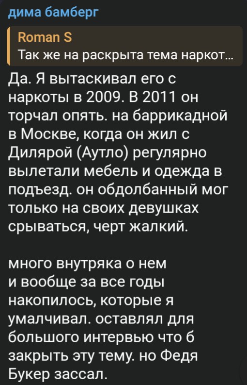 Туда же антон с. Как конспирология забавно, а по фактам он сам потом себя дискредитировал вбросами про рак, которые потом сам же типа опроверг Маркович с кучак и рады были с ним иметь дела, пока он их не кинул, тогда уж обиделись и не только из-за мести начали пиздеть, а еще из-за исповеди, мол он жалуется, да как он посмел, а вот мы тоже бедные-несчастные и упустили богатый хуй маркович вообще не могла определиться - то ли он абьюзер, то ли жалкий нелепый лошок