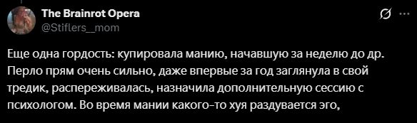 >>26068458 — Начала сталкинг как минимум с 2017 года, признавалась как планомерно втиралась в окружение с целью добраться до КПСС, ставила фото его матери на аватарку, делала коллажи с ним, упоминала в позитивном ключе Антихайп, строя образ своей девчонки — Солгала о своем диагнозе, рассказав, что у неё БАР в десятилетней ремиссии. На самом же деле периодически впадала в мании и психозы, бросала самовольно таблетки, провоцируя мании. После винила КПСС в том, что он вывел её из ремиссии — Солгала о статусе секс-работницы (вероятно), обесценила право другого человека на информированный выбор — Проявила инициативу к интимной связи сама, инициировала создание эротического контента,(вероятно) на его устройство, после шантажировала публикацией — Создала иллюзию длительных и серьёзных отношений, делая множество фото, часть из которых без ведома КПСС и публиковала их с романтизированным подтекстом. Утверждала, что роман длился годы и начался, пока партнёр ещё был в других отношениях (хотя на деле связь длилась не больше месяца по переписке, около недели вживую, в чем призналась лишь спустя время) Намеренно искажала хронологию и близость, чтобы утвердить себя в роли значимой фигуры в его жизни — Сама слила на двач информацию о якобы существующих отношениях с КПСС, обнародовала работу в вебкам, при этом выкладывая фото с учениками из школы, спровоцировав волну травли в свой адрес, чтобы создать у КПСС ощущение вины и ответственности. Использовала травлю как инструмент эмоционального давления, манипулируя его сочувствием и стремлением защитить, чтобы вернуть его расположение через подложную драму — Под ложным предлогом и давя на жалось вывезла мать КПСС за город, где без предупреждения организовала встречу с собственной семьёй, фактически устроив сватовство - без согласия, без объяснений и в обход любой договорённости. Сознательно использовала обман, чтобы втянуть человека в ситуацию с социальным и эмоциональным давлением, чтобы потом использовать как доказательство серьезности отношений с КПСС. —Сделала тайную запись на диктофон без согласия, выложила в интернет. На тот момент он уже прекратил с ней контакт и уехал — Из сообщения матери КПСС видно, что Айша продолжала на протяжении трёх лет писать ей с разных номеров телефона, обходя блокировки — Есть неподтвержденная информация, что физически так же преследовала, находясь в Питере — Публично назвала нынешнюю девушку КПСС «шизофреничкой», ссылаясь на инсайдерскую информацию. Использовала психиатрическую стигму как инструмент дискредитации и морального давления, к себе и своему диагнозу требуя сочувствия — Распространяла уничижительные и стигматизирующие высказывания, приписывая ей шизофрению с детства, описывая сцены, где та якобы «мазала стены говном», и обобщённо высмеивая людей с шизофренией. Упоминала отца Сони Грезе в этой стигматизации. При этом позже была обнаружена статья, где Айша подробно рассказывала о собственных госпитализациях, вспышках паранойи, агрессии, разрушительном поведении в детстве и опыте физического удержания в психиатрии — Также имеется зафиксированный эпизод, в котором она призналась, что выдумала историю о групповом изнасиловании («меня насиловал весь класс») и в состоянии мании сама в это поверила, что ставит под сомнение достоверность её 