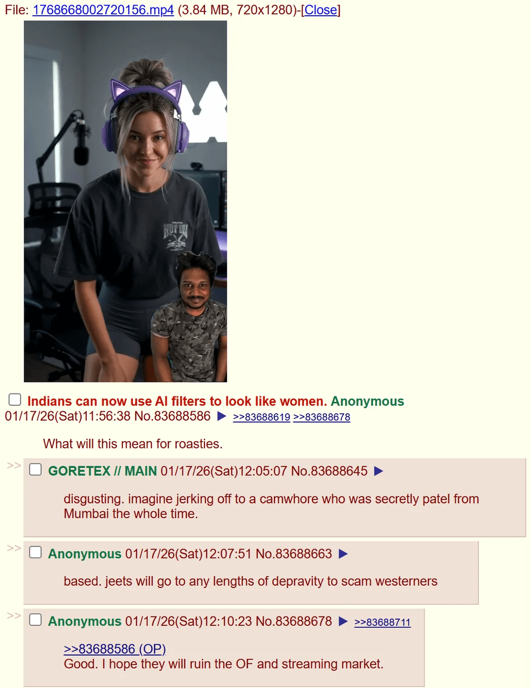 -Индусы теперь могут использовать ИИ-фильтры, чтобы выглядеть как женщины. -Что это будет значить для всех? - Отвратительно. представьте, как дрчишь на камворку, а на самом деле это весь стрим был потайной Пател из Мумбаи - Типично, джиты готовы на любую степень изврата, лишь бы обмануть западников - Отлично. Надеюсь, они вообще заруинят весь рынок OnlyFans и стримов.