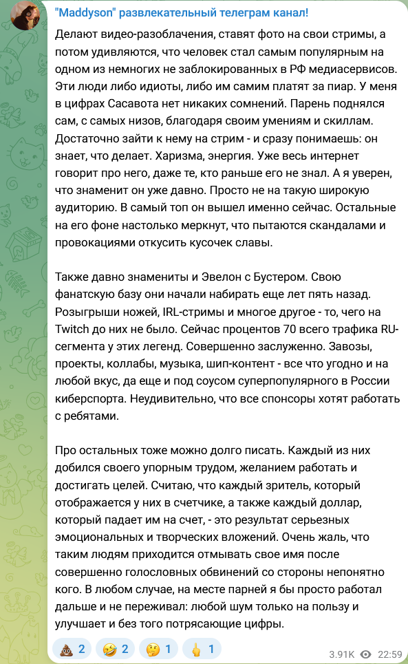 Делают видео-разоблачения, ставят фото на свои стримы, а потом удивляются, что человек стал самым популярным на одном из немногих не заблокированных в РФ медиасервисов. Эти люди либо идиоты, либо им самим платят за пиар. У меня в цифрах Сасавота нет никаких сомнений. Парень поднялся сам, с самых низов, благодаря своим умениям и скиллам. Достаточно зайти к нему на стрим - и сразу понимаешь: он знает, что делает. Харизма, энергия. Уже весь интернет говорит про него, даже те, кто раньше его не знал. А я уверен, что знаменит он уже давно. Просто не на такую широкую аудиторию. В самый топ он вышел именно сейчас. Остальные на его фоне настолько меркнут, что пытаются скандалами и провокациями откусить кусочек славы.
