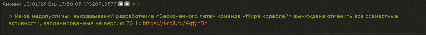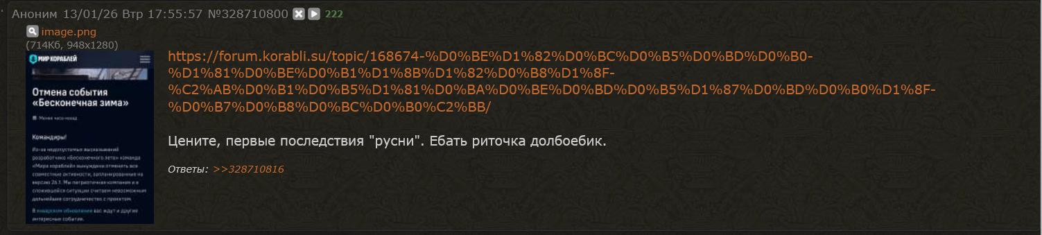 1. ФИСТ - В С Ё ! Во всяком случае, пока. 2. Ожидается Бибофест 19-22 мая. Наблюдаторы с августовской ВС решительно призывают не боящихся деанона провести наблюдаторство за майским мероприятием Бибы. Биба обещает отсутствие коммерции и неадеквата, пристально следим. 3.Биба провел ВТ. Судя по фотке – банальная сходка сычей и чьих то родичей. Пикрил в шапке треда. 4. БЛЯДЯ В С Ë! В тред были вкинуты скрины, где Блядя Дилдатов официально признает свое поражение и говорит, что его посадят за ответную зеркальную заяву А НАС ТО ЗА ЩО. В честь этого он написал, что "этот уходящий год будет для него последним". Возможно он удавился. Так как этот элемент асоциальный, мы об его РКН и не узнаем. Пикрил в шапке треда. 5. Алкочленодевка ака Рита Тайнакова ака Антон Аркатов официально заанонсил БЛ-2. Сие творение пока никак иначе как высером не назвать. Ритан настолько охуел, что даже на заглавный арт проскочили две нейробабы с шестью пальцами. И да, связи высера с бордами не наблюдантся, а хуита сугубо коммерческая. 6.Вики В С Ë! Некий пидрила залил туда запрещенку и пожаловался сам на себя, в итоге Набеговики была снесена хостом. Всё было архивировано. Ведутся работы над восстановлением, осуществляется перенос на неолурк. Вероятно этим пидрилой был Блядя Дилдатов. 7. Объявился анон, желающий возродить ведение архива. Скидывайте контент за 2024-2026 в тред, желательно с указанием примерной даты его появления. 8. Продолжается бессрочный конкурс творческого контента. Некоторые аноны даже пилят мод на БЛ и самостоятельную игру. 9.???