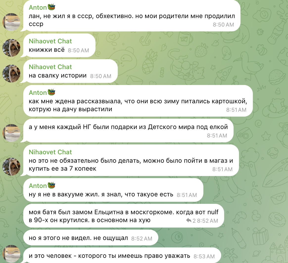 >>26102400 > А кто-нибудь в курсе, его батёк сдох уже? Честно сказать? Не могу тебе ответить на этот вопрос, но оба родителя у него возрастные. Отец с 44, а мать с 45. И отец с матерью живы (если верить на то число когда он писал, что же сейчас хуй знает) >Просто угарно было бы посмотреть на разговор условного быка из 90х отца и его чмошника сына, который в 40 лет занимается хуйнёй в интернете Честно? Я думаю ему поебать, может конечно он в глубине души бомбит, что его сын не стал гига-успешным кабанчиком который "решает проблемы" и также зарабатывает миллионны, но кто успел включить мозг, тот выжил, а кто не успел, те лежат в могиле. Такова была реальность в 90-х и их конце. (И многие мои знакомые с этим сталкивались, и даже видели.) >>26102341 Узнай у него в личке, контакты есть. Может он бомбанет, а может честно тебе признается, кто-ж знает.