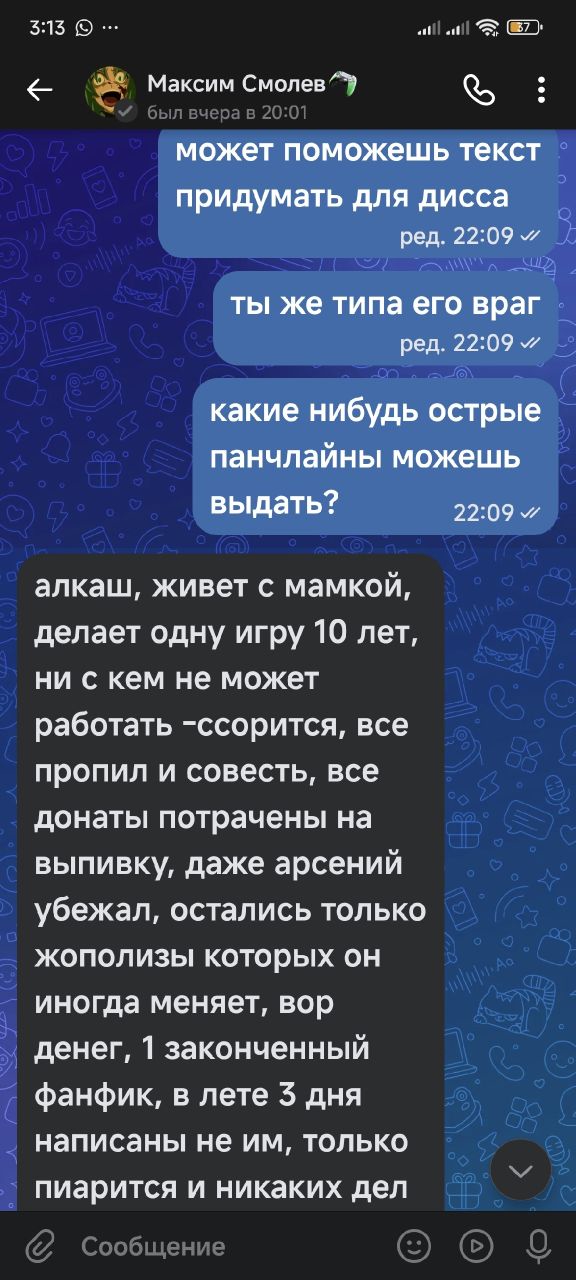 >>26076606 > Ну, например, кое-что, от чего можно дальше крутить А че искать, то? Вся инфа лежит в открытом доступе, лол. Я потратил буквально 5 минут поиска и наткнулся на его второй аккаунт. 1) В публичной оферте указан его рабочий аккаунт: dreamtaleSG (id5013752734) 2) Но для различных чятиков он использует свой основной аккаунт, а именно @dreamtal3 (d5150446346) и на нём имеется Premium. Например вот один из комментариев в чате (пикрил два), и то что инфа находится в открытом доступе, и вы её не нашли, просто доказывает, ваше неумение искать. кхех. Вот ссылочка, и подумайте слегка, что с ней делать: aHR0cHM6Ly90Lm1lL0hlbGxzcGFyYWRhc2lzZS8yOQ== Плюсом ко всему, есть старая писанина Аркатыша с самлиба: https://web.archive.org/web/20140901115247/http://samlib.ru/a/arkatow_a_a/dolgayadorogadomoy.shtml За сим, всё.