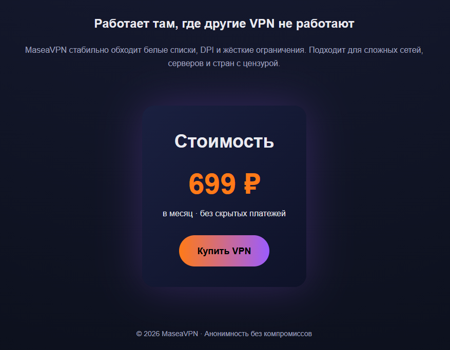 Надёжно обходит белые списки и ограничения там, где другие VPN не работают.
