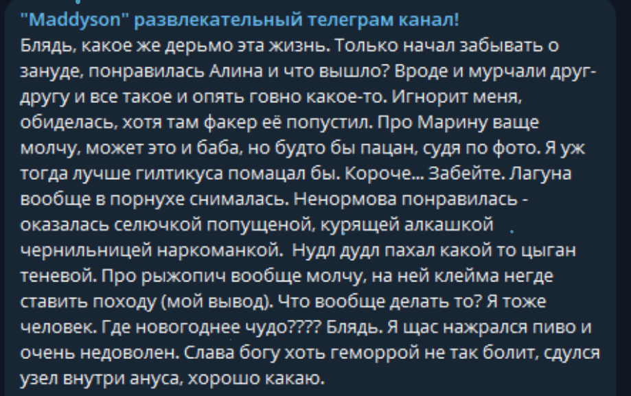 >>25549208 Бредик не пишем. Если бы это было так, она бы никуда не сливала, а высосала из конфликта с Илюшей какушей все возможные соки. А по возвращении не окуклилась бы в дискорде - это вообще полный бред в плане заработка. И про ненависть к "мужикам" как-то не склеивается с её отношениями с теневым AndyFall♣DarkGothLord♣2000♣.