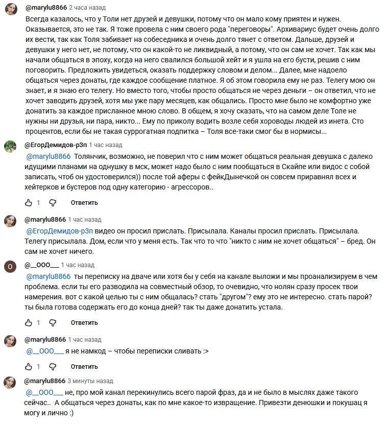 В 2020-2022г периодически возвращался и снова пропадал, более менее регулярно стал выкладывать видосы с начала 2023 года. С октября 2024 активно пилит видосы для бусти, в том числе обзоры на еду. Удалил свой основной аккаунт из-за нападок хейтеров.