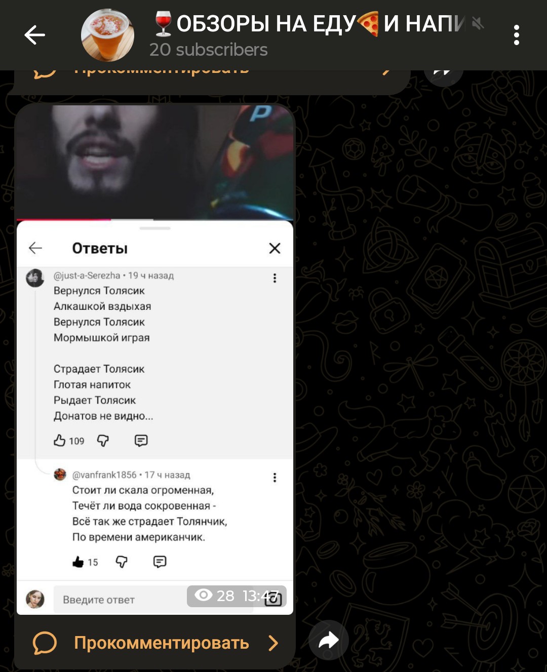 >>26141249 @monkey нах такое нормисы смотрят, типа 40 летний девственник дома сидит и смешно чавкает поедая дошик это интересно очень? потому что толян - это чистый трэш без фильтров, нормисам заходит как guilty pleasure, типа смотрю как этот перманентный не-успех жрёт хавчик и ноет, а сам сидишь в похожем ахуе и фапаешь на контраст "я-то хотя бы работаю". плюс мемный статус, архивы тредов и пасты добавляют лора, без него было бы просто бомж в камеру пердит. а чавканье - вишенка для тех, кто устал от глянцевых фудблогеров.