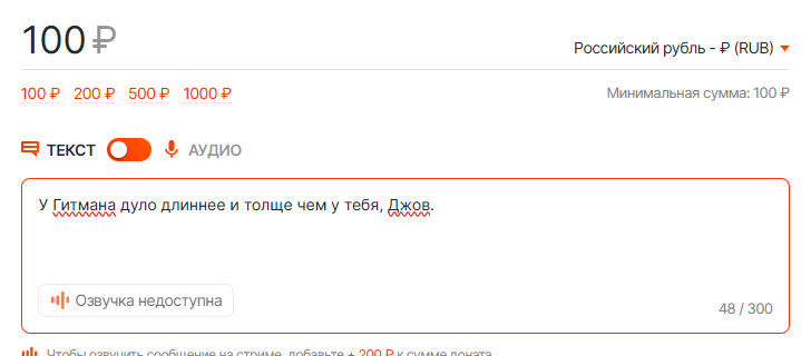 >>26140062 → >донат вообще божеский стоит А на самом стриме: "это не буду, только за 10к". Алиночка аж в ахуй выпадала на фоне там. Потом вообще 300к поставил цель - бить себя током через ошейник два дня по 12 часов за маты.