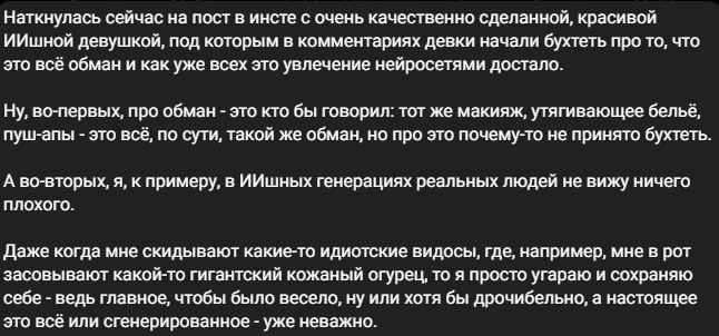 Сейчас в одном отеле в Сеуле сидит немая настоящая женщина и под звуки скрежета зубов смотрит в приватной вкладке браузера стрим Ляси. Какая гамма эмоций крутится в голове у этой настоящей женищы - мы можем только догадываться.