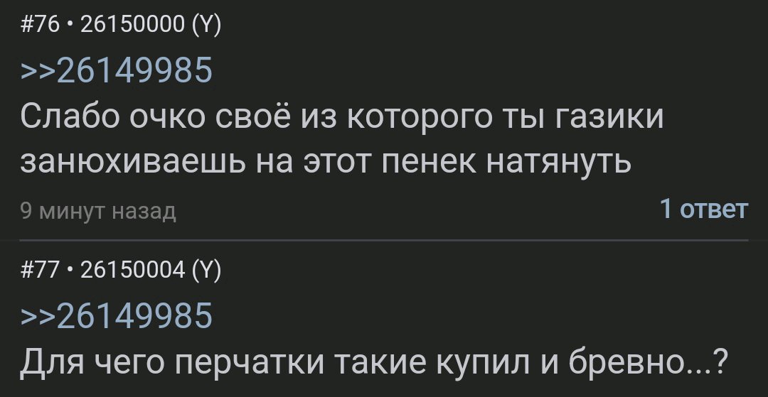 >Да он пиздабол, который тут в этом году только появился. Писал по началу что он москвич с несколькими хатами и что у него бабы были, а потом признался, что нищеброд и инцел не нюхавший баб.