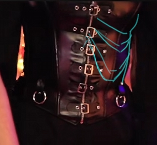 Но как по мне, то чтобы оценить ее реальную фигуру достаточно посмотреть на ее ЖИРНОЕ пузо, которое не смог утянуть даже кожаный корсет, стянутый ремнями.