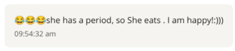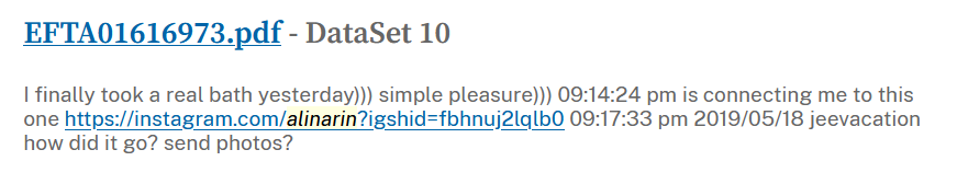 >>26168266 "She has a period" судя по контексту - это про какую-то другую, которая в данный момент с челом, который переписывается с Эпштейном. А 1 и 3 скрины - про Алину, там в будущем времени.