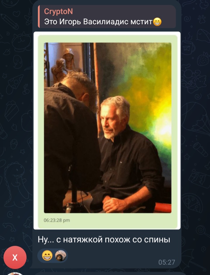 Мне, кстати, всегда казались странными ее отношения с Василиадисом. Он прям совсем на папика не тянул чисто по вайбам. А теперь нашлось объяснение их точки соприкосновения.