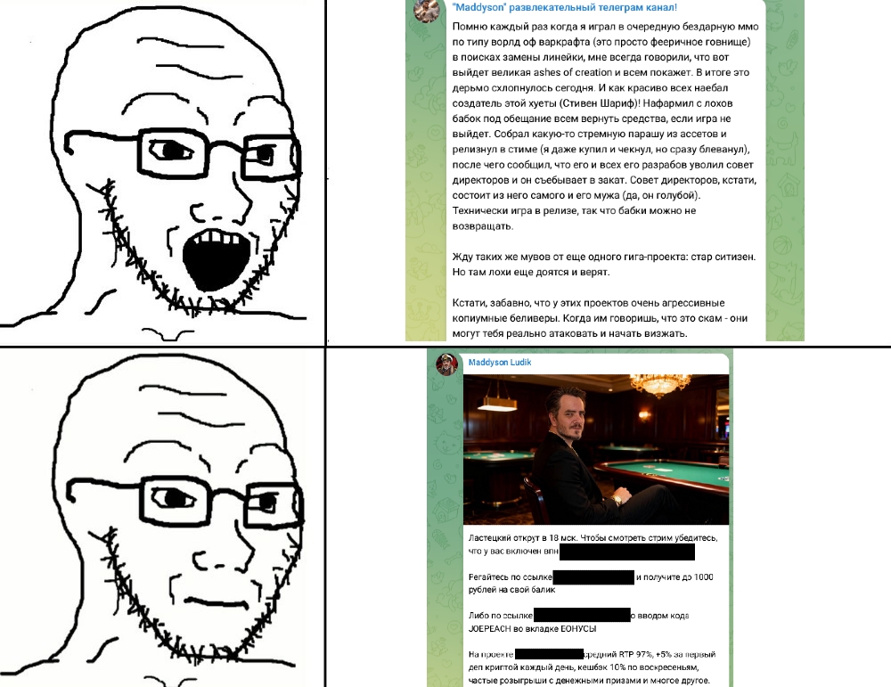 >>26170554 >Стар Ситизен Я видел обзор на этот кал лет 100 назад. Там мне какой-то мужик на полном серьезе затирал хуйню уровня как вот когда тебе одноклассник рассказывал, что у него дома ГТА 10 на полке лежит и там можно в свой дом зайти и себя найти. Типа вообще полный бред нес про то, какой там охуенный ГЕЙмплей буджет. Я даже не помню, что именно он рассказывал, но я еще тогда понял, что это попил и наеб гоев нереальный, а мне было типа ну я хз 13???