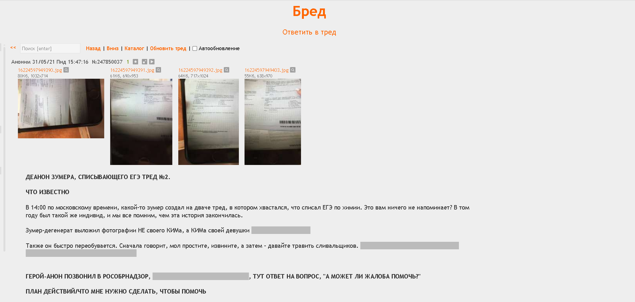 >>25369303 >где его телку двачеры с дианонили по ЕГЭ и ей аннулировали результаты классика>>25369303 >просто поскрину каких то там символов двачеры по приколу сдеанонили там много ума не надо, потому что у каждого билета егэ был уникальный номер, а долбоеб запостил фото вместе с идентификатором. и бабу не деанонили, а просто настучали, что опубликован биллютень с номером ххххххх - а это запрещено, и бабу автоматом дропнули и аннулировали Но бугурт знатный был - тут ты прав