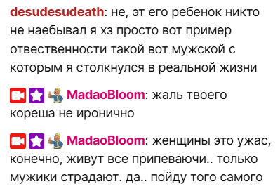 >>26071306 смотрела кейпоп, зашла в новости, под руку попалась новость об алиментах, начала истерить что мужчины не платят алименты и не хотят забирать детей, всех под один уровень поставила, в чате ее поправили, привели примеры, она поняла что еще играть в ведьмака и ее никто не поддерживает за истерила и выключила стрим, после стрима плакала, зашла в тред, увидела обсуждение и удалила запись
