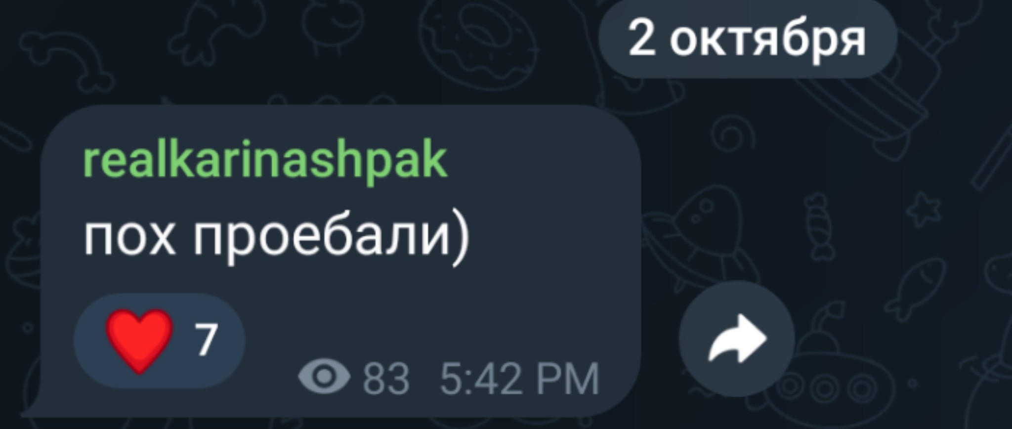 карина шпак стала медиа трупом и шлюхой результат 6 летнего пиара бомжа и всех остальных просто представьте уровень этой хуиты которую всем интернетом пиарили а она ничего из себя не выдавила