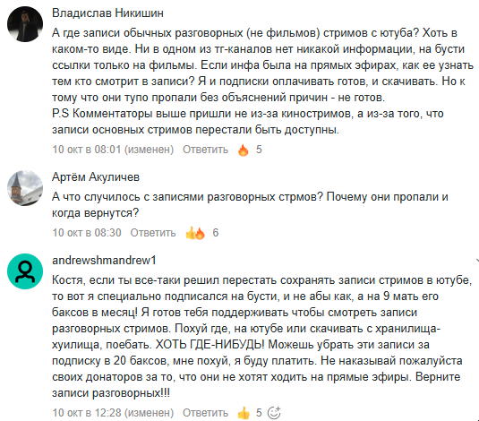 >>25364588 Я так понял из поста на бусти и комментов, что он про киностримы и их записи высрался. Разговорные якобы никуда не делись, хуй пойми блять. Реально только людей запутал мудак ебаный. Может разговорные последние были не удачные и он скрыл. Инфы нигде нет, его спрашивают про это, а он про киностримы сидите разъясняет. В пизду короч