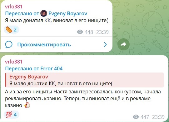 Анаститутка сейчас в канале пишет: "Зайдите на стрим поддержите КК, ему что-то совсем плохо". Захожу на стрим, слышу: "Чтоб ты сдох и твоя мать сдоха, желаю рака тебе и твоей матери". Поддержим доброго человека! Бедный, попал в беду. Тяжело ему, игрушка сломалась. Как жить? Теперь все вокруг виноваты. Как не поддержать такого хорошего человека?