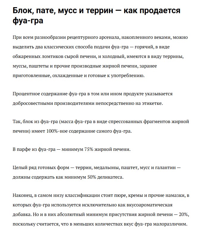 > Это как назвать противный жирный и вредный паштет - Фуа-гра Дурачок демонстрирует полное непонимание и колхозную тупизну. Фуагра - это на французском жирная печень - foie gras. Это никакой не паштет, это печень целиком. А уж потом из нее можно сделать мусс, паштет или просто пожарить. В ресторанах именно что режут ломтик сырой печени, обжаривают и подают, это никакой не паштет. Думай башкой или гугли прежде чем обкакаться. Это как назвать сырое яйцо в скорлупе яичницей.