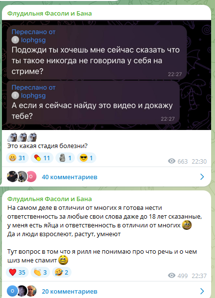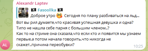 >>25449218 Фемка то это понятно, но неуважение и отвращение как к личности к прышу у нее есть. Я вот сегодня ну точнее сейчас посмотрел ее стрим, увидел что идёт всего два часа, дай думаю посмотрю по бырому и там момент был, что она с чатерсами общается и говорит что завтра(сегодня) пойдет на растяжку какую-то со стримершей и вот она думает как ей постримить типа, после или до, после типа она думала в бар с ней сходить или покушать и такая наверное до растяжки типа постримлю(а это получается днём надо стримить) и говорит мол Андрей конечно спать будет ещё, но я его ВЫГОНЮ в другую комнату. Я понимаю что это мелочь, но я думаю такого можно на каждом стриме найти ее