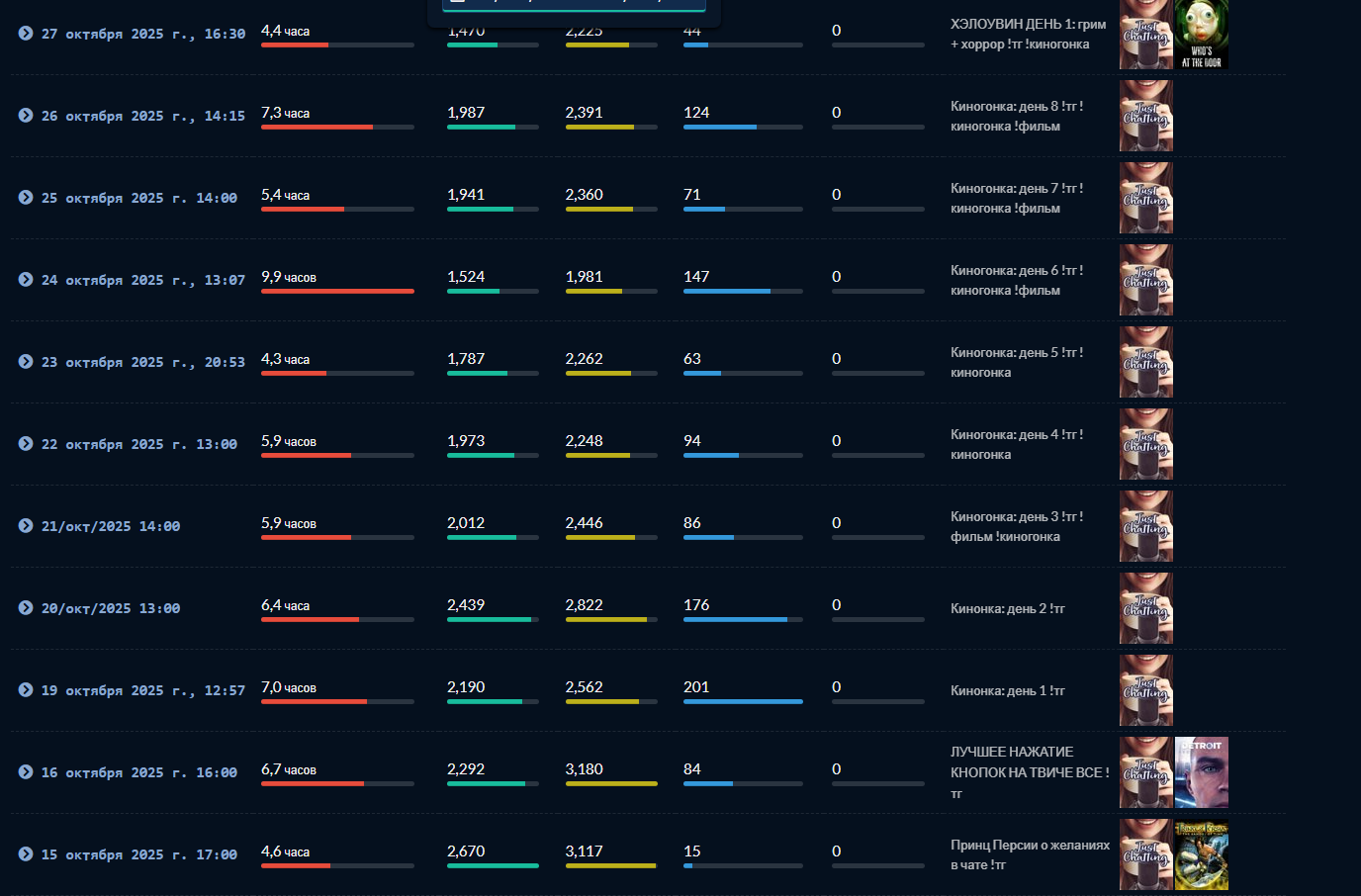 >>25474289 >>25474297 >>25474326 3 реплая. Давай еще 7, малютка нешизло, 4.4 часа первый ж стрим в твоем скрине. 4.3 также на твоем скрине. Или ты думаешь люди не будут смотреть на твой скрин? Где 6часовые+ стримы о которых ты верещишь. Кроме марафона на первом дне? Еле до 6 часов на твоем скрине стримы дотягиваются, и то не всегда. Среднее тут не 6+, а как раз меньше.